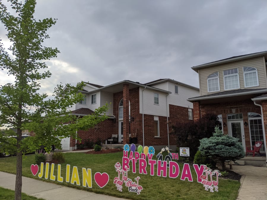 This Kitchener Waterloo Yard Card rental sign is great for any age or occasion. Whether it's an Over the Hill surprise, Happy Birthday, or any special occasion you'd like to celebrate, these pink birds are sure to brighten anyone's day!