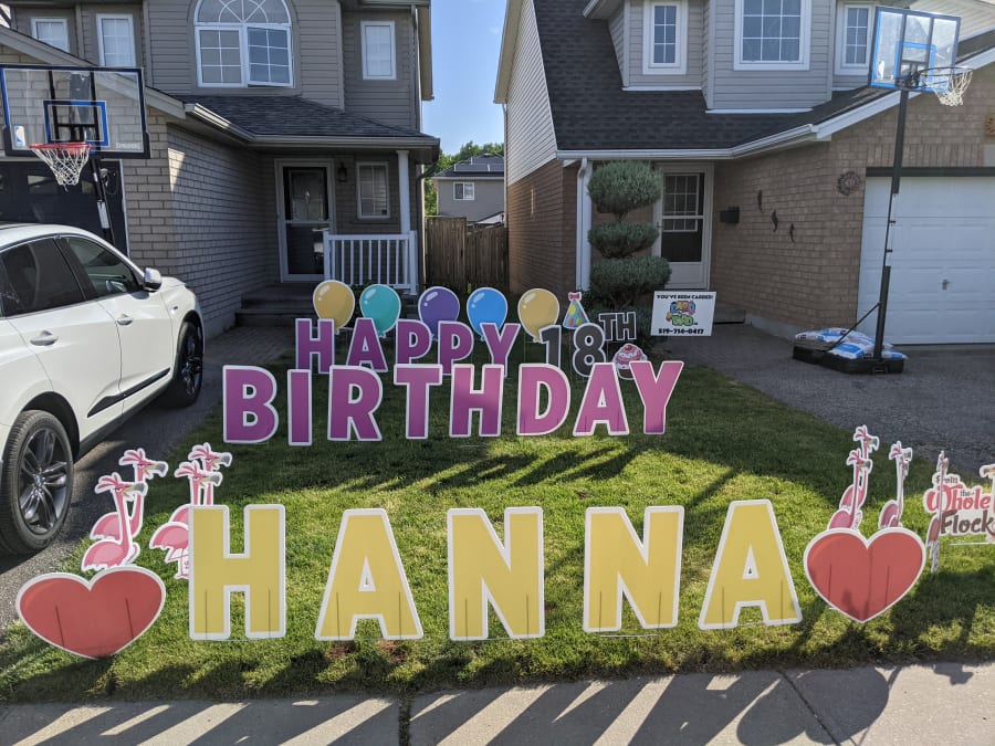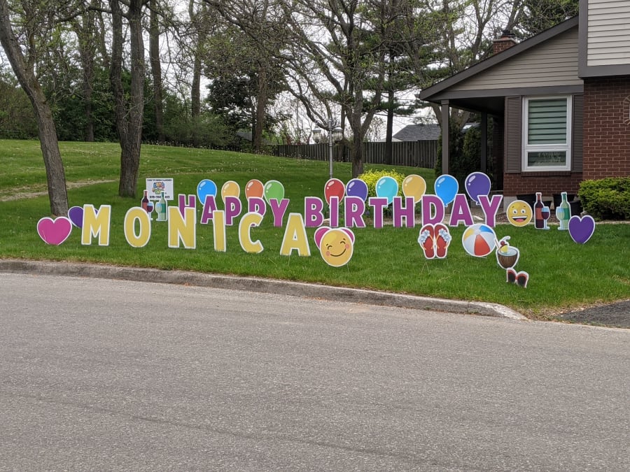 If you want a different saying on the lawn, just let us know. We can customize it how you want! Includes the Pinkish Purple 2 foot letters, age, smiley emoji's and balloons!