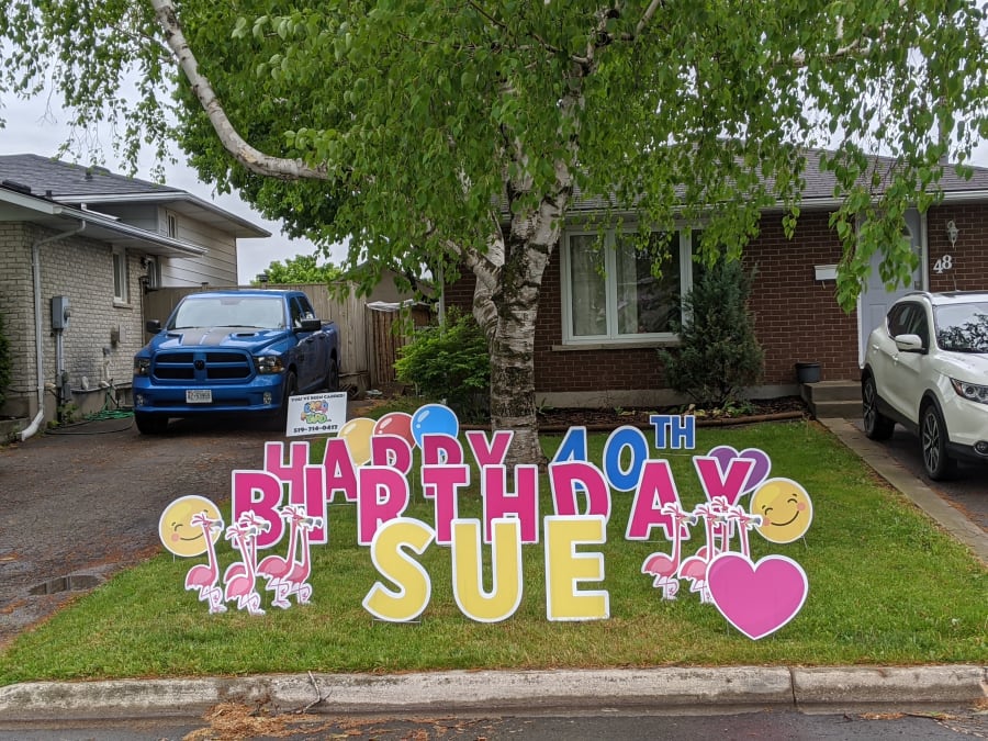 This Kitchener Waterloo Yard Card rental sign is great for any age or occasion. Whether it's an Over the Hill surprise, Happy Birthday, or any special occasion you'd like to celebrate, these pink birds are sure to brighten anyone's day!