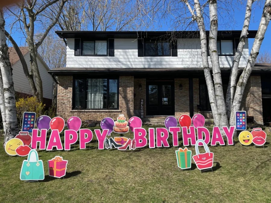 This Happy Birthday shop-o-holic Cambridge Yard Greeting rental sign is great for the shop-o-holic you know! We go full all out with a variety of ways to say Happy Birthday or any other message on the lawn with these brightly colored presents, lips, shoes and purses. Here are a few examples: -HAPPY 40TH BIRTHDAY JENNY! If you want a different saying on the lawn, just let us know. We can customize it how you want! Includes the 2' letters, and a variety of colorful cars, and multiple street signs. As with any Yard Greeting, We can add the person's name on the lawn too!