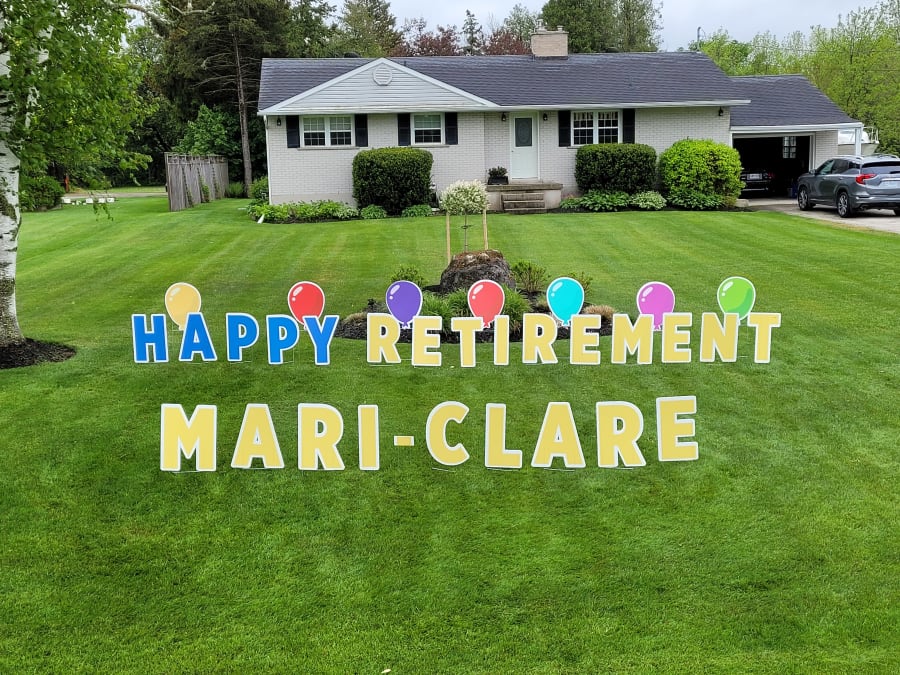 Includes Happy in Red, Blue or Pink and Retirement in Yellow with 2' foot letters, smiley emoji's and balloons! Please specify colour of Happy and include emoji requests in the "Any Additional Info' section of your booking and we will do our best to accommodate your request.